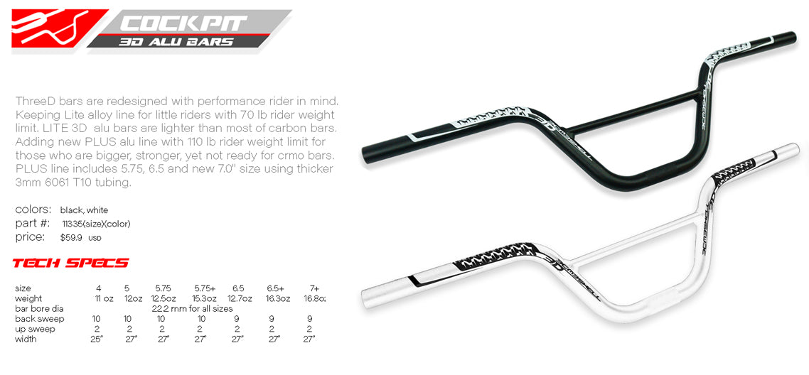 ThreeD bars are redesigned with performance rider in mind. Keeping Lite alloy line for little riders with 70 lb rider weight